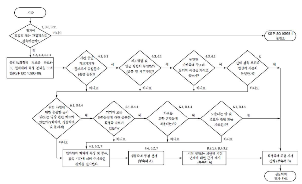 인체에 사용하는 모든 의료기기 완제품 및 원재료에 대한 생물학적 평가는 [그림]에서와 같이, ISO 14971에 따른 위험관리 과정에서의 생물학적 평가계획을 통해 수행해야 합니다. 이 위험관리 과정을 통해 생물학적 위해 요인을 확인하고, 생물학적 위험을 예상하여 그 수용 가능성을판단합니다. 제조자는 생물학적 평가 계획을 다양한 관련 정보를 기반으로 수립해야 하며, 원재료와 시험 과정에 대한 다양한 선택의 장·단점을 고려하고 그 사항을 기록해야 합니다. 제조자는 의료기기의 제조에 사용되는 원재료의 선택에 있어서 원재료의 성질(화학적, 독성학적, 물리적, 전기적, 형태적, 기계적 성질 등)과 특성이 사용목적에 적합한가를 우선적으로 고려하여야 합니다.