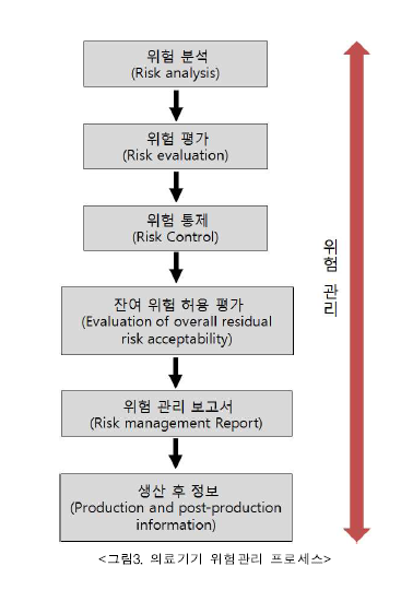의료기기 소프트웨어의 개발 및 유지 활동은 「의료기기 제조 및 품질관리체계의기준」에 의한 의료기기 제조자(manufacturer)가 품질시스템에서 수립한 절차에 따라 이루어져야 하며, 동시에 위험관리 프로세스 내에서 개발 및 유지되어야 합니다. 즉, 의료기기 소프트웨어도 일반 의료기기와 마찬가지로 제조 및 품질관리체계의 기준과 위험관리 프로세스가 조화를 이루는 범위 내에서 개발 및 유지되어야 합니다. 일반적으로 위험관리 프로세스는 의료기기에서 발생할 수 있는 위험분석(risk analysis), 위험평가(risk evaluation), 위험통제(risk control), 잔여위험허용평가 (evaluation of overall residual risk acceptability), 위험관리보고서(risk management report), 생산 및 생산 후 정보(Production and post-production information)의 단계로 진행됩니다. 위험분석 단계는 의료기기의 의도된 사용목적 및 안전성에 관련된 특성들의 식별, 이미 알고 있거나 예측 가능한 위해요인(hazard)의 식별, 각 위해요인에 대한 위험산정을 통해 이루어집니다. 위험평가 단계에서는 식별된 각 위해요인에 대하여 제조자는 위험관리 계획서에 정의된 판단기준을 이용하여 산정된 위험이 위험감소를 하지 않아도 될 만큼 낮은지를 결정하여야 합니다. 위험통제 단계에서 제조자는 위험을 허용할 수 있는 수준으로 감소하기에 적합한 위험통제 대책들을 식별한 후 위험통제를 실행하여야 합니다. 그리고 위험통제 수단이 적용된 후 잔여위험들에 대하여 허용 평가를 하여야 합니다. 이러한 일련의 위험관리 프로세스 에서의 절차들은 위험관리 보고서에 기록되어야 한다. 제조자는 생산 및 생산 후 정보 단계에서 의료기기에 대한 정보를 검토하기 위한 체계적인 절차를 수립하고 유지하여야 합니다. 이상의 위험관리 프로세스는 의료기기 및 의료기기 소프트웨어 개발 시 필수적으로 적용되어야 합니다.