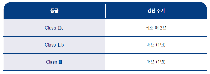 제조자의 시판 후 감시 시스템(Post-Market Suveillance, PMS) 수행 제조사는 각 기기에 대해 기기의 위험 등급에 비례하고 기기 유형에 적합한 방식으로 시판 후 감시 시스템을 계획, 수립, 문서화, 실행 유지 및 갱신하여야 하고, 품질경영 시스템의 필수적인 부분이 되어야 합니다. 시판 후 감시 시스템은 전체 수명 주기 동안 기기의 품질, 성능 및 안전에 관한 관련 자료를 능동적이고 체계적으로 수집, 기록및 분석하며, 필요한 결론을 도출하고 예방 및 시정 조치의 결정, 실행 및 감시하는 데 적합해야 합니다. 특히, 제조사의 감시 시스템으로 수집된 자료는 다음을 위해 사용되어야 합니다. (a)이익-위험(Benefit-risk)결정을 갱신하고 위험성 관리를 개선, (b)설계 및 제조정보, 사용설명서 및 라벨의 갱신, (c)임상 평가의 갱신, (d)안전성 및 임상 성능 요약(SSCP)의 갱신, (e)예방, 시정 또는 현장 안전 시정치를 위한 필요성의 확인, (f)기기의 사용성, 성능 및 안전성의 개선을 위한 선택사항의 확인, (g)관련되는 경우, 다른 기기의 시판 후 감시에 기여, (h) 경향보고(Trend reprot) 입니다. 시판 후 감시 보고서(Post-Market Surveillance Report, PMSR) Class I 기기의 제조사는 시판 후 감시 계획의 결과로서 수집된 시판 후 감시 자료의 분석 결과 및 결론을, 취해진 예방 및 시정조치에대한 설명과 함께 요약한 시판 후 감시 보고서를 작성하여야 합니다. 이 보고서는 필요한 경우 업데이트되어야 하며 요청 시 보건 당국에 제공 되어야 합니다. 그리고 정기 안전성 갱신 보고서(Periodic safety update report, PSUR) Class IIa, IIb, III 기기으 제조사는 정기 안전성 갱신 보고서 PSUR를 작성해야 합니다. PSUR에는 다음을 명시해야 합니다. (a)이익-위험성 결정의 결론, (b)PMCF의 주요 발견사항, (c) 기기의 판매량과 그 기기를 사용하는 집단의 규모와 다른 특성의 산정평가, 그리고 실질적인 경우, 그 기기의 사용주기 PSUR의 갱신주기는 등급에 따라 아래의 표를 참고합니다.